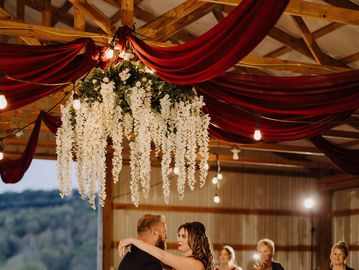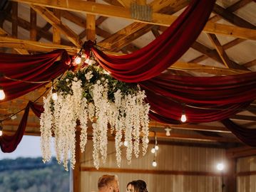 A dramatic hanging installation featuring cascading florals that create a romantic, garden-inspired statement overhead. Perfect for transforming tents, receptions, or focal design areas.